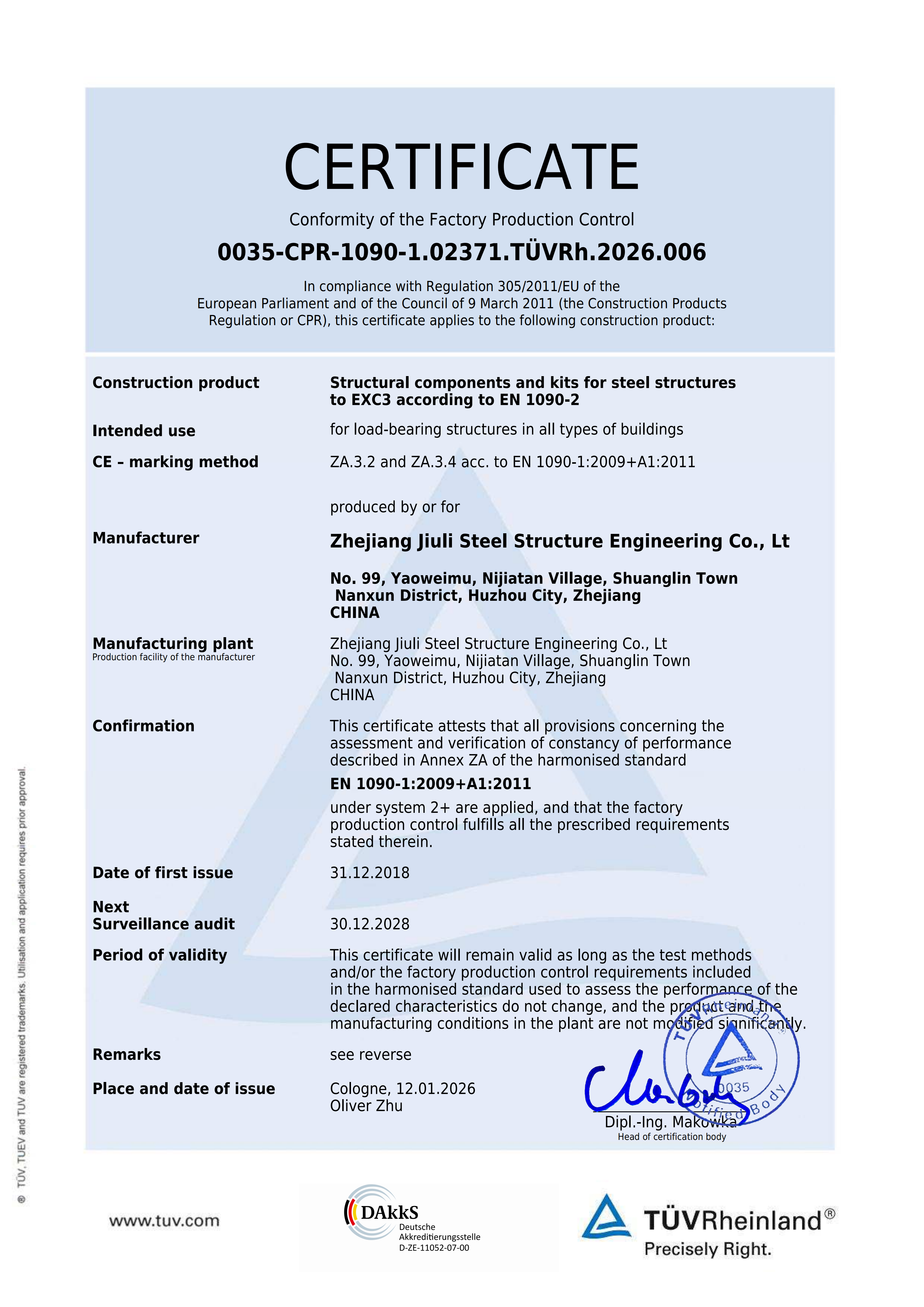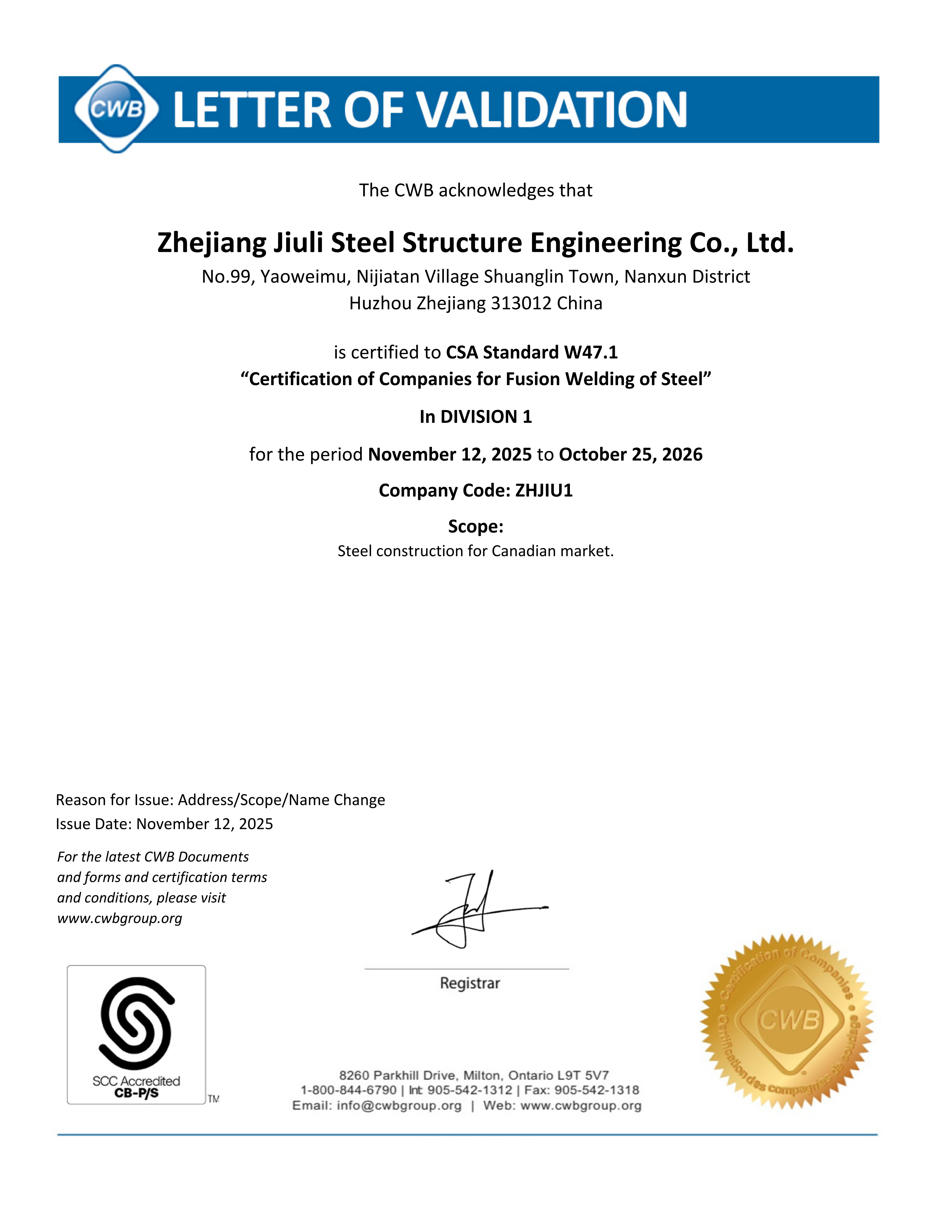公司建有完善的質(zhì)保體系,通過(guò)了IS09001:2015 質(zhì)保體系的認(rèn)證。擁有建設(shè)部頒發(fā)的建筑工程施工總承包貳級(jí)、鋼結(jié)構(gòu)專業(yè)承包壹級(jí)資質(zhì)、制造特級(jí)資質(zhì)。專業(yè)承接各類工業(yè)與民用工程的建設(shè),鋼結(jié)構(gòu)的設(shè)計(jì)、制造和安裝。公司立足國(guó)內(nèi)市場(chǎng),目前已在全國(guó)建立多個(gè)營(yíng)銷辦事處,逐步形成了輻射全國(guó)的營(yíng)銷網(wǎng)絡(luò),并積極參與國(guó)際競(jìng)爭(zhēng),公司擁有加拿大焊接協(xié)會(huì)資格論證的加拿大 CWB 證書,加拿大A660-10證書,美標(biāo) AISC 證書,歐標(biāo)EN1090和IS03834 證書,可承接來(lái)自歐美、澳洲等有特殊要求鋼構(gòu)件的出口加工,已成功地在非洲馬達(dá)加斯加國(guó)及博茨瓦納設(shè)立了分公司久立鋼構(gòu)是湖州地區(qū)率先進(jìn)入國(guó)際市場(chǎng)的建筑企業(yè)之一。